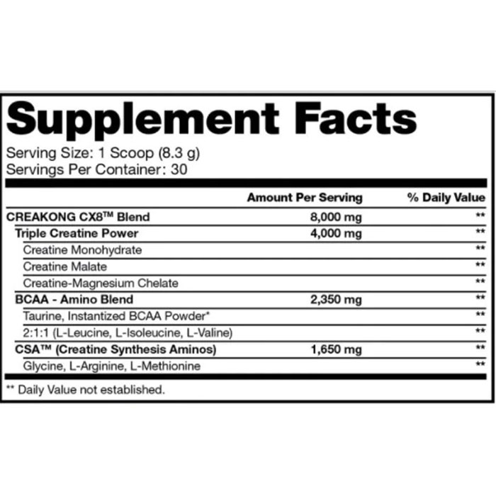 Our creatine powder has been jacking up lifters in nearly 100 countries worldwide, now CREAKONG CX8 raises the standards. This triple-threat formula combines 4 grams of highly absorbable creatine monohydrate, malate, and magnesium-chelate that have been turbo-charged with 4 grams of BCAAs, taurine and our Creatine Synthesizing Matrix (CSM) of precursor amino acids like arginine and methionine. This unique nutrient tech drives internal creatine and ATP production while boosting muscle protein synthesis to support your already amped power efforts. Y'know, like a supercharger forcing oxygen into a v8 engine! Don't leave your results to chance - accelerate your creatine game with CREAKONG CX8. More CREATINE, more POWER, more MUSCLE!