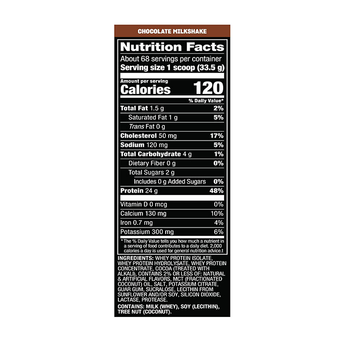 Ingredients (chocolate flavor, may vary by flavor): whey protein isolate (milk), whey protein hydrolysate (milk), cocoa powder, natural flavors, salt, sweeteners (sucralose, acesulfame-K), enzyme blend (proteases, lactase), sunflower lecithin.