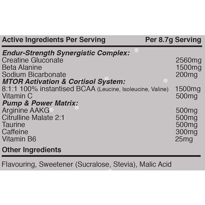 Arginine AAKG, Citrulline Malate, Taurine, Caffeine (300mg), Vitamin B6, Flavouring, Malic Acid, Colouring Sweetener (Sucralose, Stevia)