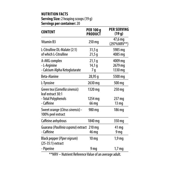 Citrulline Malate, Arginine AKG, Beta-Alanine, Acidity Regulator (E500), Anti-Caking Agent (E551), L-Tyrosine, Caffeine, Green Tea Leaf Extract (Camellia sinensis L.Kuntze, 55% EGCG), Bitter Orange Extract ( Citrus aurantium var. amara), Guarana Seed Extract (Paullinia cupana Kunt, 50% caffeine), Black Pepper Fruit Extract (Piper nigrum L., 95% piperine), Rice Starch, Red Beet Juice Concentrate, Sweetener (Sucralose), Flavouring, Flavourings, Colour [E163, E150c, E160a, (E102, E133)]