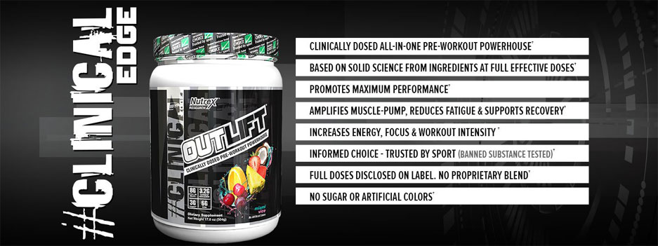 Outlift Clinical by Nutrex stands apart as one of the world's exclusive, all-in-one pre-workout solutions - meticulously crafted to not only boost your energy levels but also to enhance pumps, overall performance and most important - build muscle. Infused with ingredients backed by scientific research - this formula does a lot more than your typical pre-workout. It's clinically dosed to deliver peak effectiveness. Outlift Clinical sets the standard for what a pre-workout powder should do.